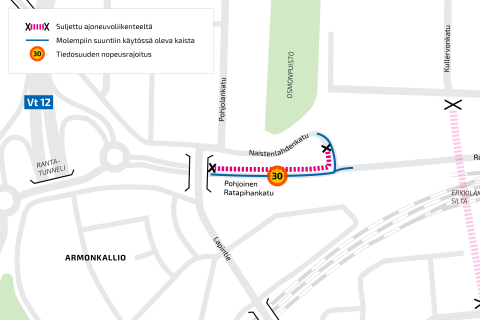 Pohjoisella Ratapihankadulla tehdään hulevesikaivojen ja -linjojen asennuksia viikolla 41. Töiden vuoksi Kastinsillan ja Naistenlahden liittymän välisellä osuudella on yöaikaan klo 21.00–06.00 vain yksi kaista käytössä. Alueen nopeusrajoitus lasketaan 30 km/h ja liikenteenohjaajat ohjaavat liikennettä. Päiväsaikaan molemmat kaistat ovat normaalisti käytössä. Työt kestävät maanantaista torstaihin 6.–10.10.