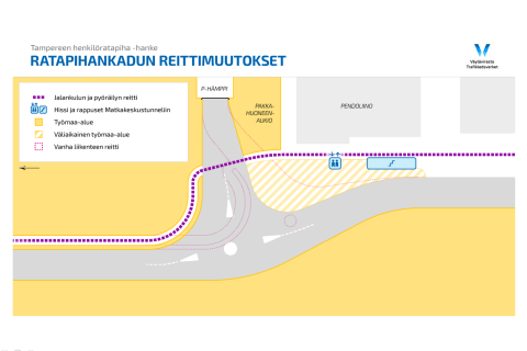 Töiden alkaessa kävelyn ja pyöräilyn reitti siirtyy Pendoliino-kiinteistön kohdalla nykyiseltä paikaltaan kulkemaan aivan kiinteistön vieressä. Järjestely kestää arviolta viikon, kunnes kaivo on asennettu ja kävelyn ja pyöräilyn reitti palautetaan aikaisemmalle paikalleen.