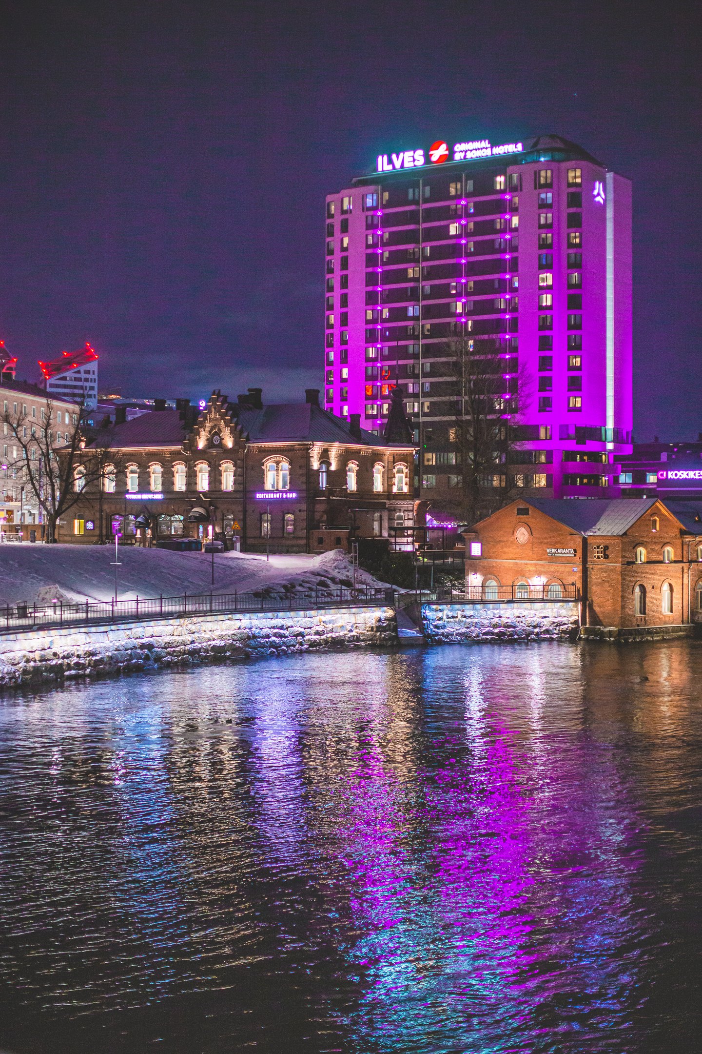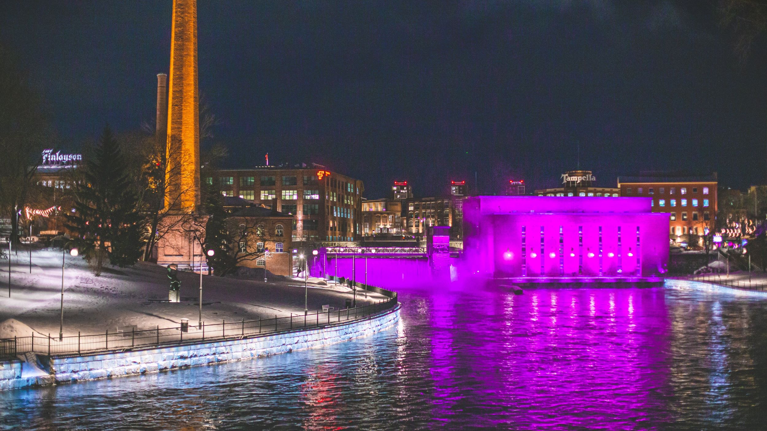 There are over 50 illuminated sites in Tampere. The urban area features architecturally significant or historically valuable buildings, city landmarks, and new construction sites illuminated on behalf of the city and other actors. The most famous illuminated sites in the city include the Tammerkoski rapid, Satakunnansilta Bridge, the Frenckell factory buildings, and the Old City Hall. The cityscape is further enriched by other illuminated sites such as the Naistenlahti power plant, Hotel Torni, the locomotive sheds, Pispala Shot Tower, and Tampere University Hospital TAYS.
