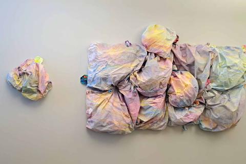 All of the materials used in the work could have ended up in the trash. Now, together, they have taken on a new form, after which they will continue their lives as materials for new stories. The work uses materials such as painting felt and disposable tablecloths. The colors used are ecological gouache paints, watercolors, beetroot, spirulina, saffron, and food colouring.