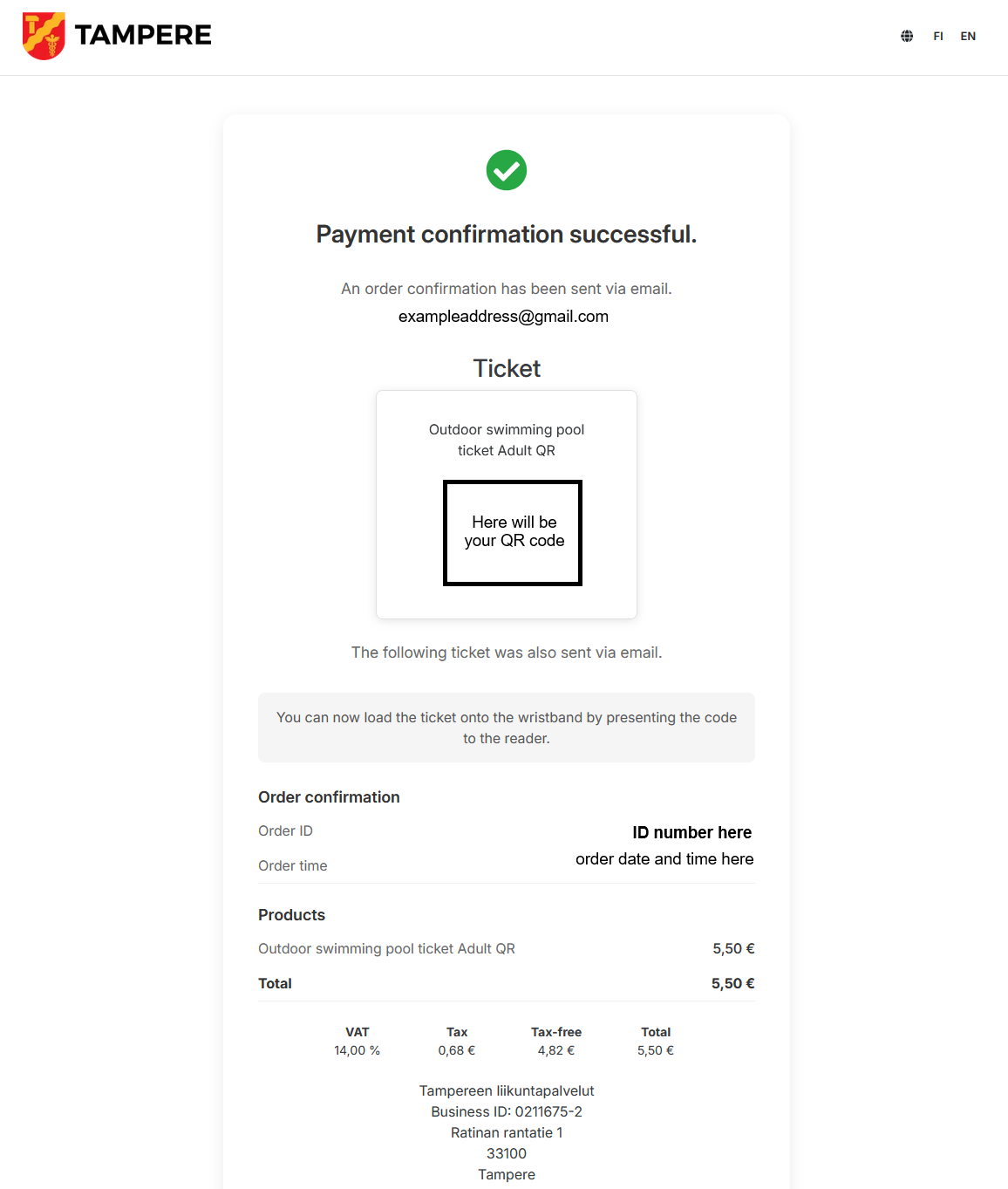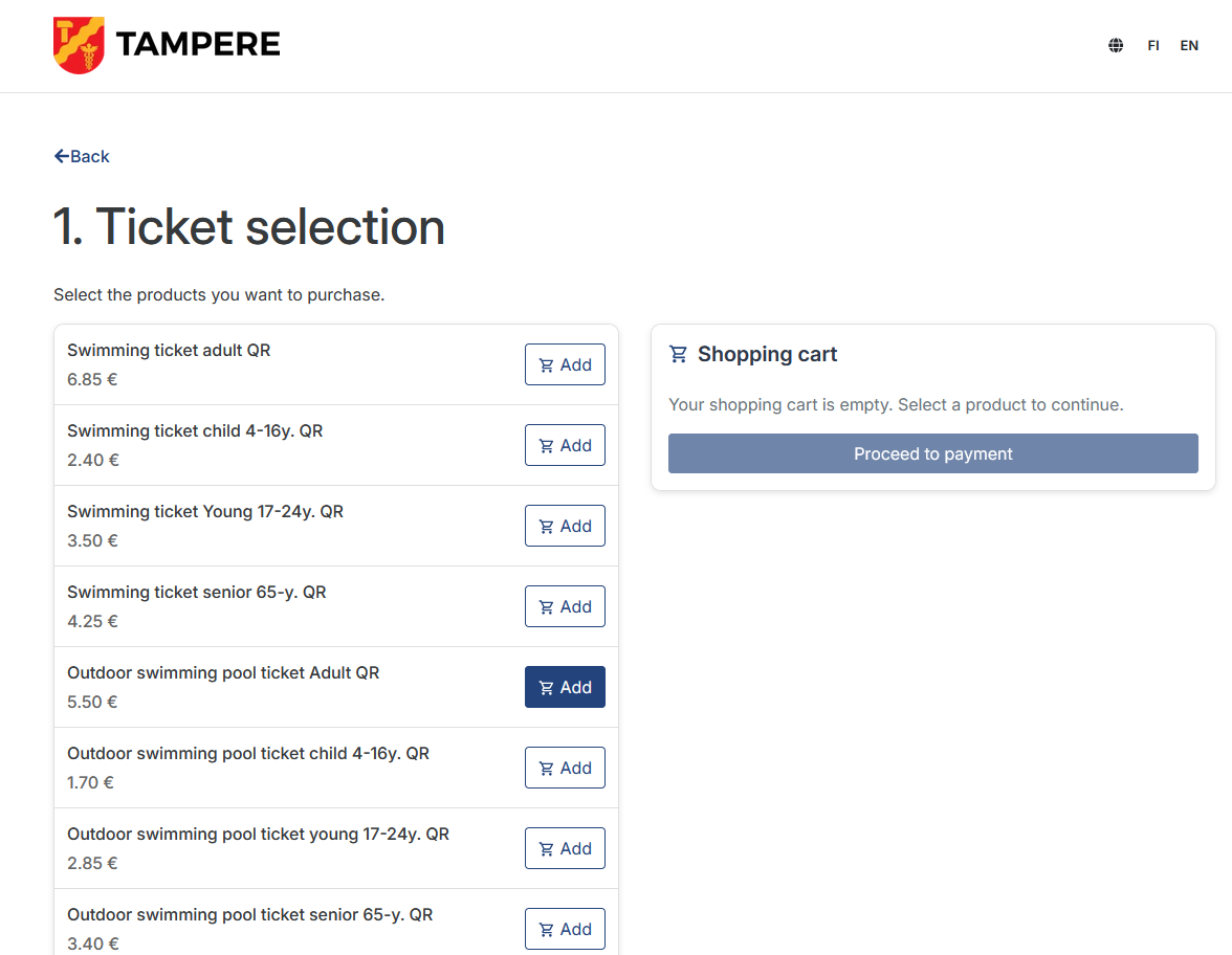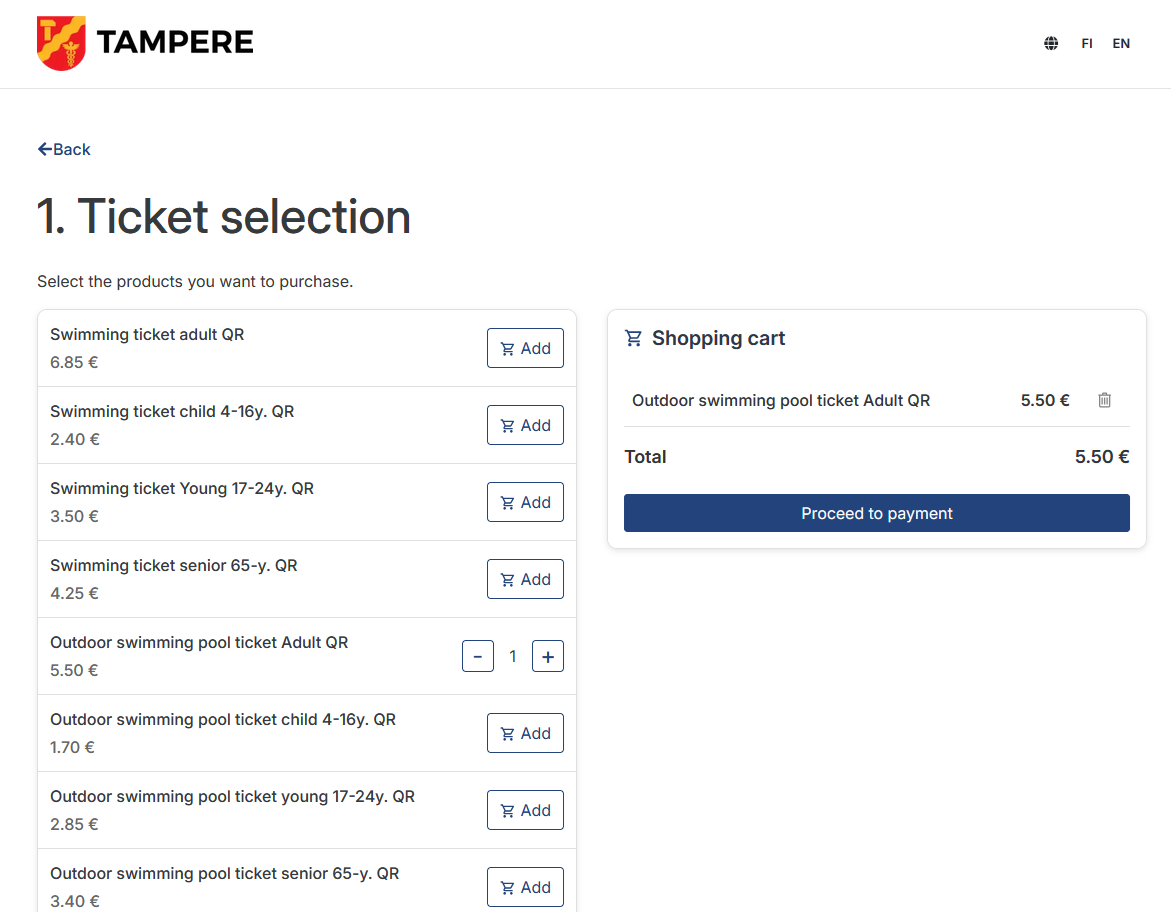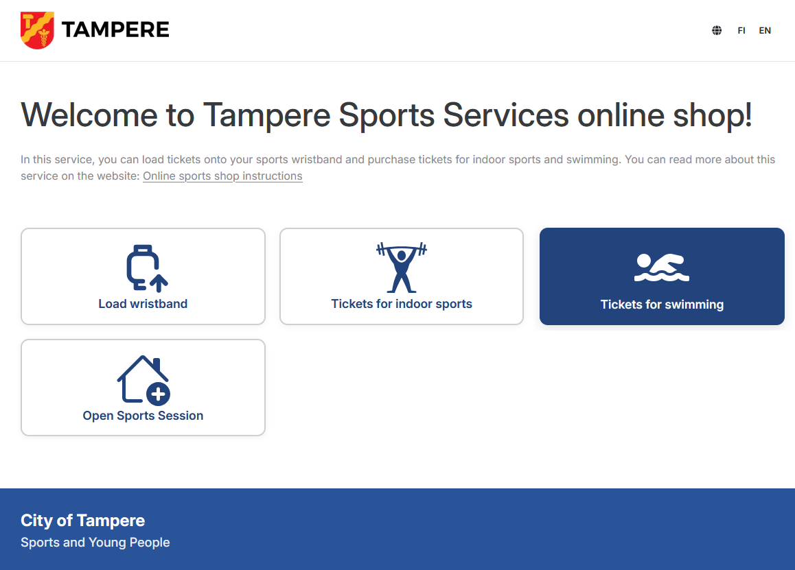 A swimming ticket purchased from the online shop can be used at Hervanta Swimming Pool, Tesoma Swimming Pool, Pyynikki Swimming Pool or Tampere Swimming Centre. You can also buy single tickets for the Tampere Outdoor Swimming Pool and Tampere Swimming Centre gym.