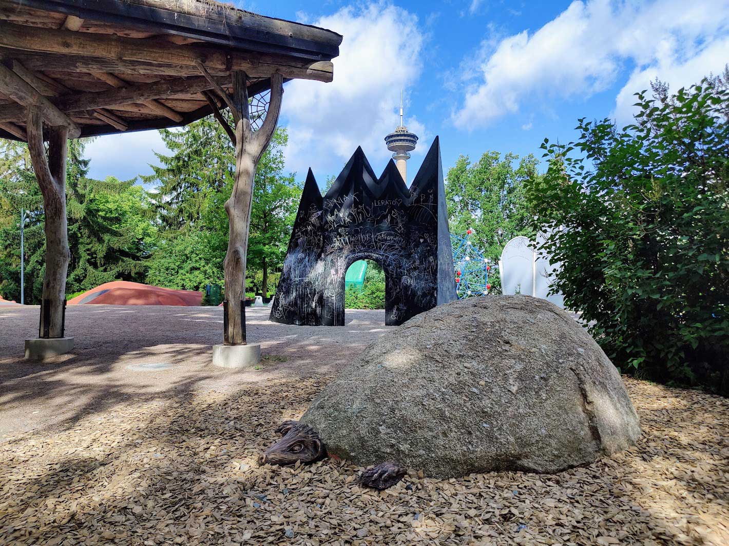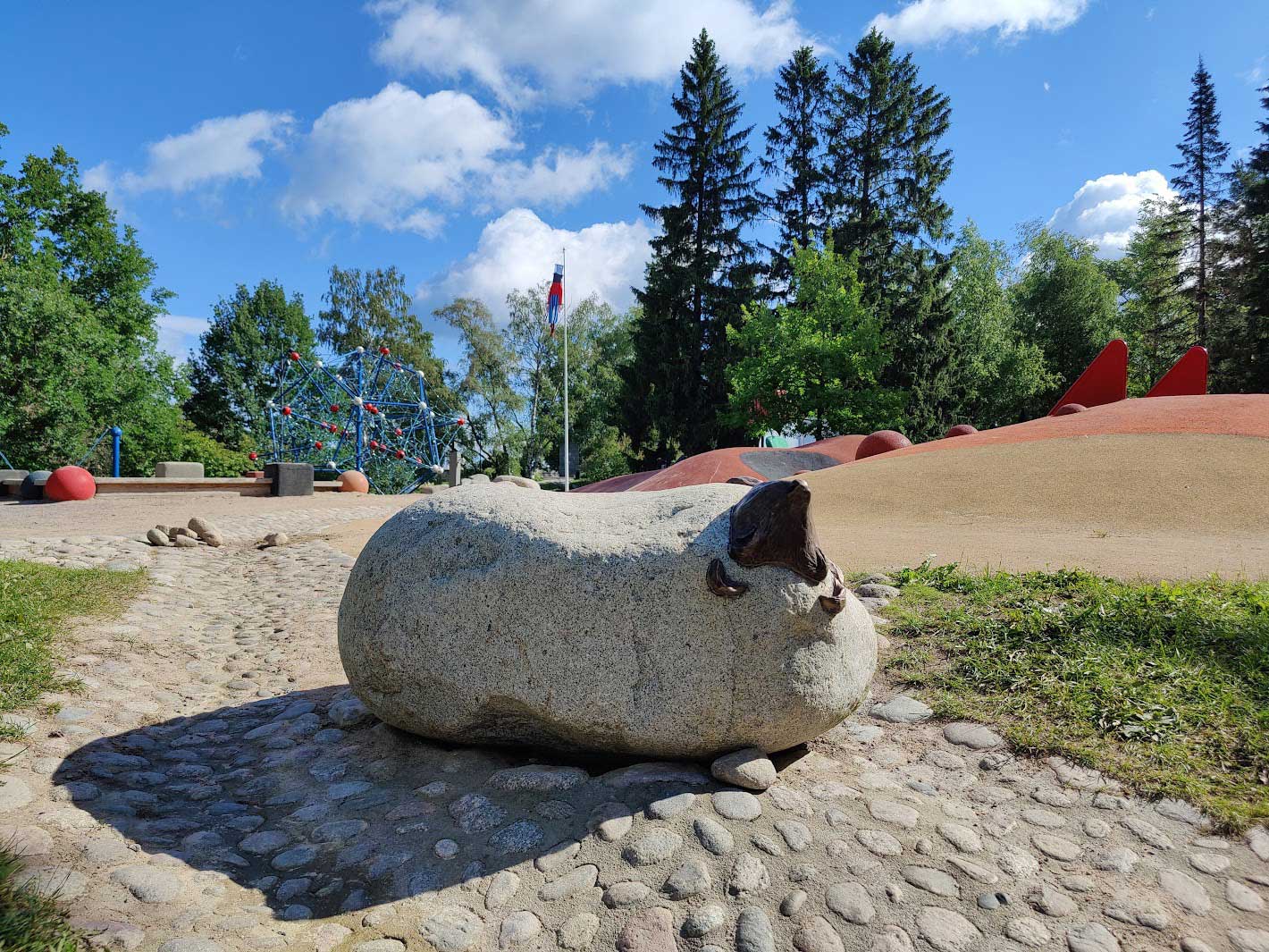 Herra PiiPoo -tuulipussi on palautettu puiston lipputankoon entistä kestävämpänä ja toimivampana. Entiset puiset ja rikkoutuneet Jaakko Vaakko -vesirotta - ja Tunteellinen siili -veistokset ovat nyt kiveä ja pronssia.