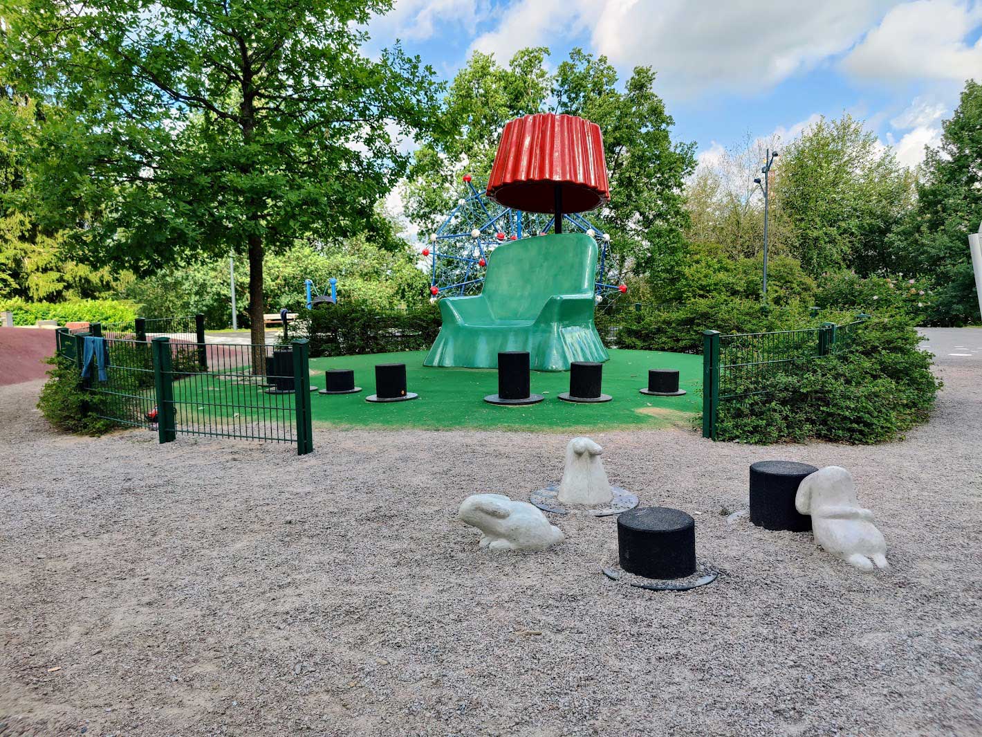 Leikkipuiston sydämessä on lukunurkkaus satupuun ympärillä, jossa istuimina ovat jättikokoinen nojatuoli sekä taikurinhattu-jakkarat. Lukutuoli ja lukulamppu kutsuvat lapsia rauhoittumaan, lukemaan ja kuuntelemaan kertomuksia. Pari kaniinia on tullut esiin hatuista lukunurkkauksen läheisyydessä.
