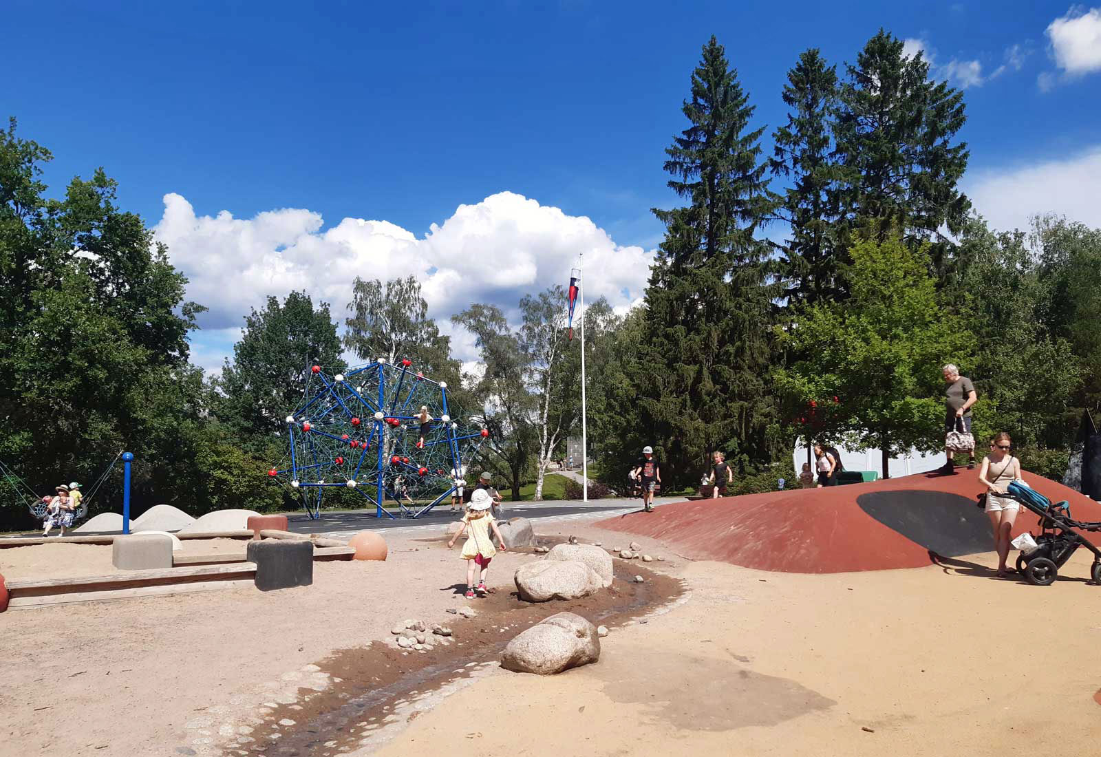 Hyppelyyn, liukuun ja kiipeilyyn löytyy sopivia paikkoja ja välineitä kuten kiipeilyverkko, jonka alustana on tähtitaivas. Leikkipaikan toisella laidalla on värikäs kumpareinen alue, jossa on trampoliineja ja liukumäkiä.