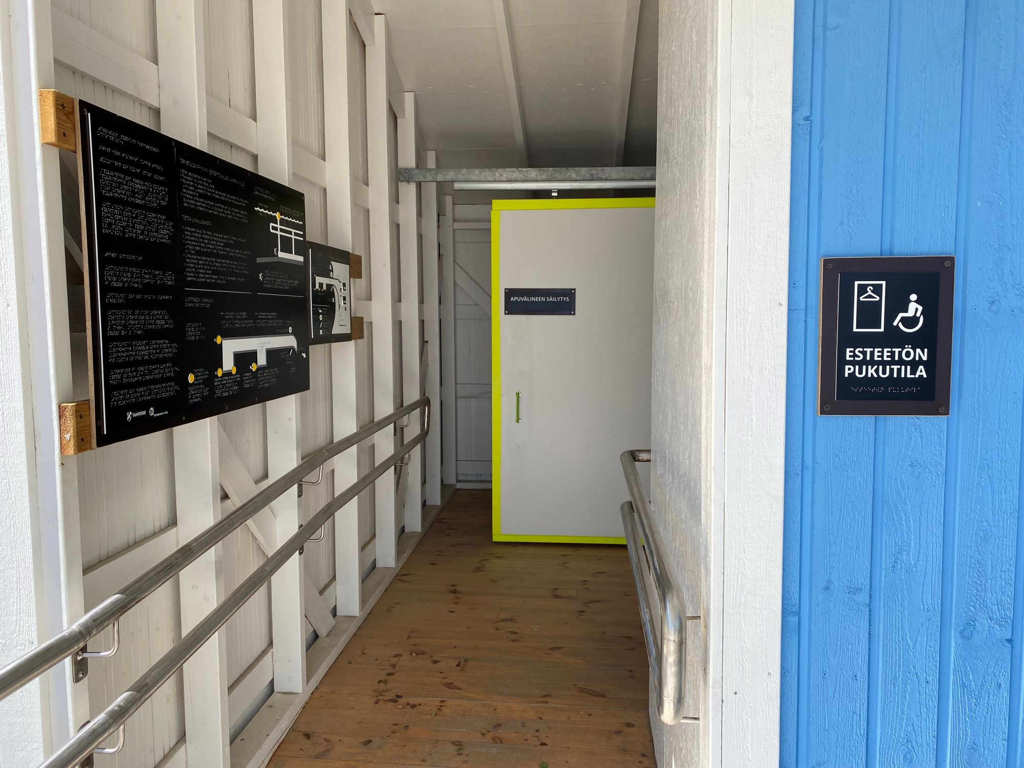 Myös uimarannan pukuhuoneissa on opastetauluja. Ne ovat pukuhuoneen sivuseinässä ja liukuovissa.