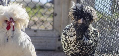 Mustavalkoinen Easter Egger -kukko ja samaa rotua oleva kellanruskea kana.